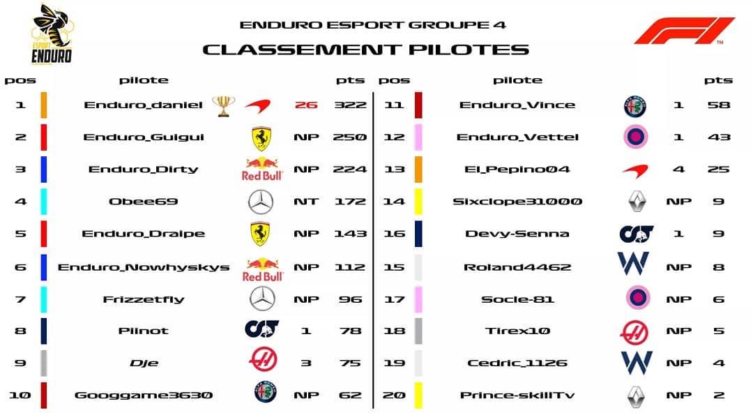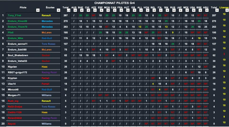 Première saison de ce groupe 4, et ne vous fiez pas au chiffre du groupe car ce groupe avait un plateau très relevé avec en sa présence: Enduro_Kiven06, Tony_F1rst, Plix6, Enduro_Thom76, et bien d'autres encore. On peut vous le dire, ce groupe nous a donné de superbes batailles. Chaque pilote a eu son lot de péripéties mais les 3 premiers du championnat avait un écart de 27 points seulement au terme de la saison! Tony_F1rst est devenu le premier champion du groupe 4. Enduro_Kiven06 et Enduro_Thom76 lui succèdent au classement.