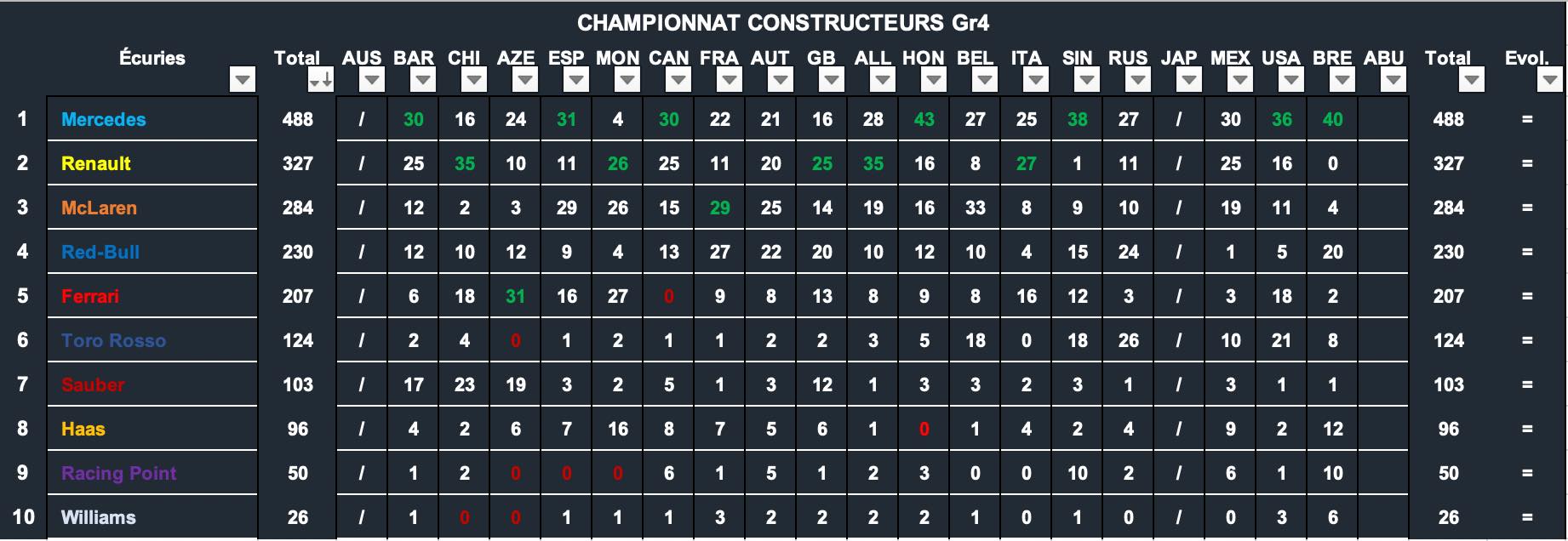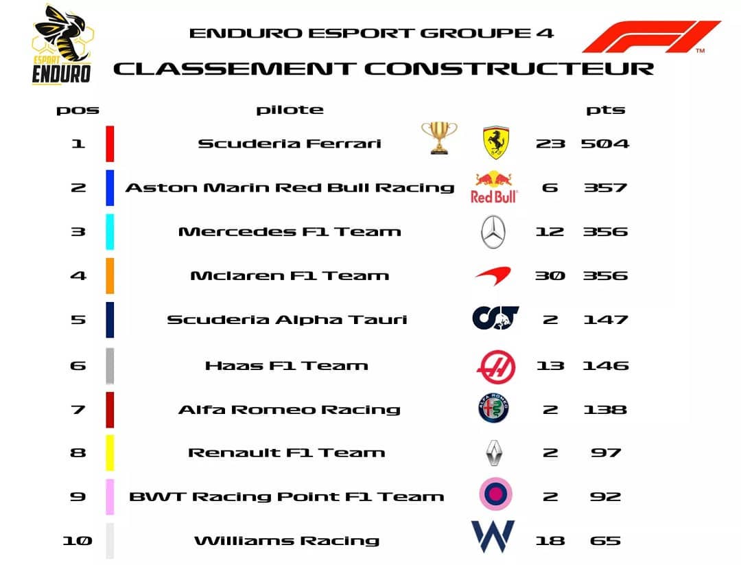 Au classement des constructeurs, le duo Mercedes a été régulier tout au long de la saison, ramenant le titre à son terme. Renault a malheureusement eu un duo un peu moins régulier mais ramène tout de même la seconde place au classement constructeurs. McLaren ( Plix6 et Enduro_ExKiiLl60) finit 3e.